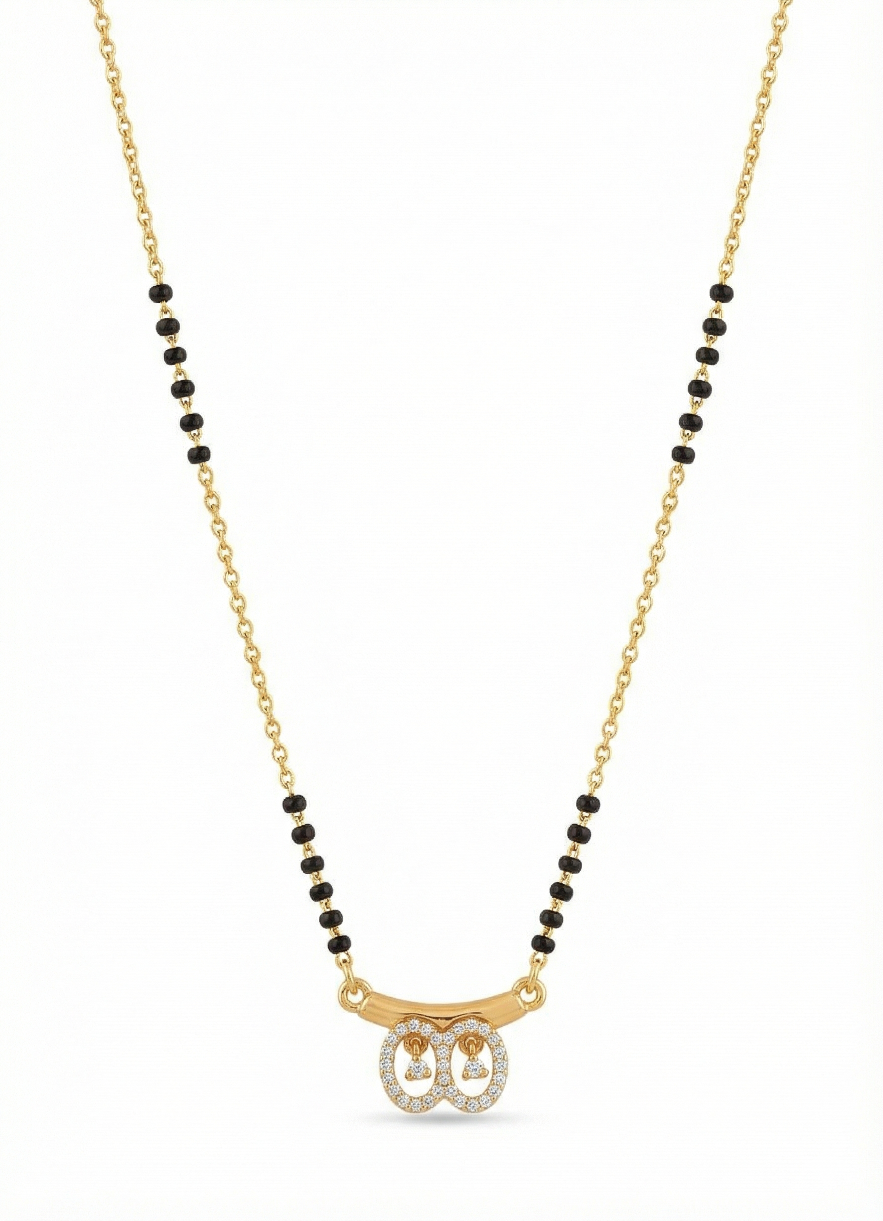 Two CZ diamond-outlined circles, each cradling a tiny diamond within, hang gracefully from a curved gold bar — symbolising two hearts bound in eternal love. Minimal, meaningful and effortlessly wearable every day on a classic black bead and gold chain.