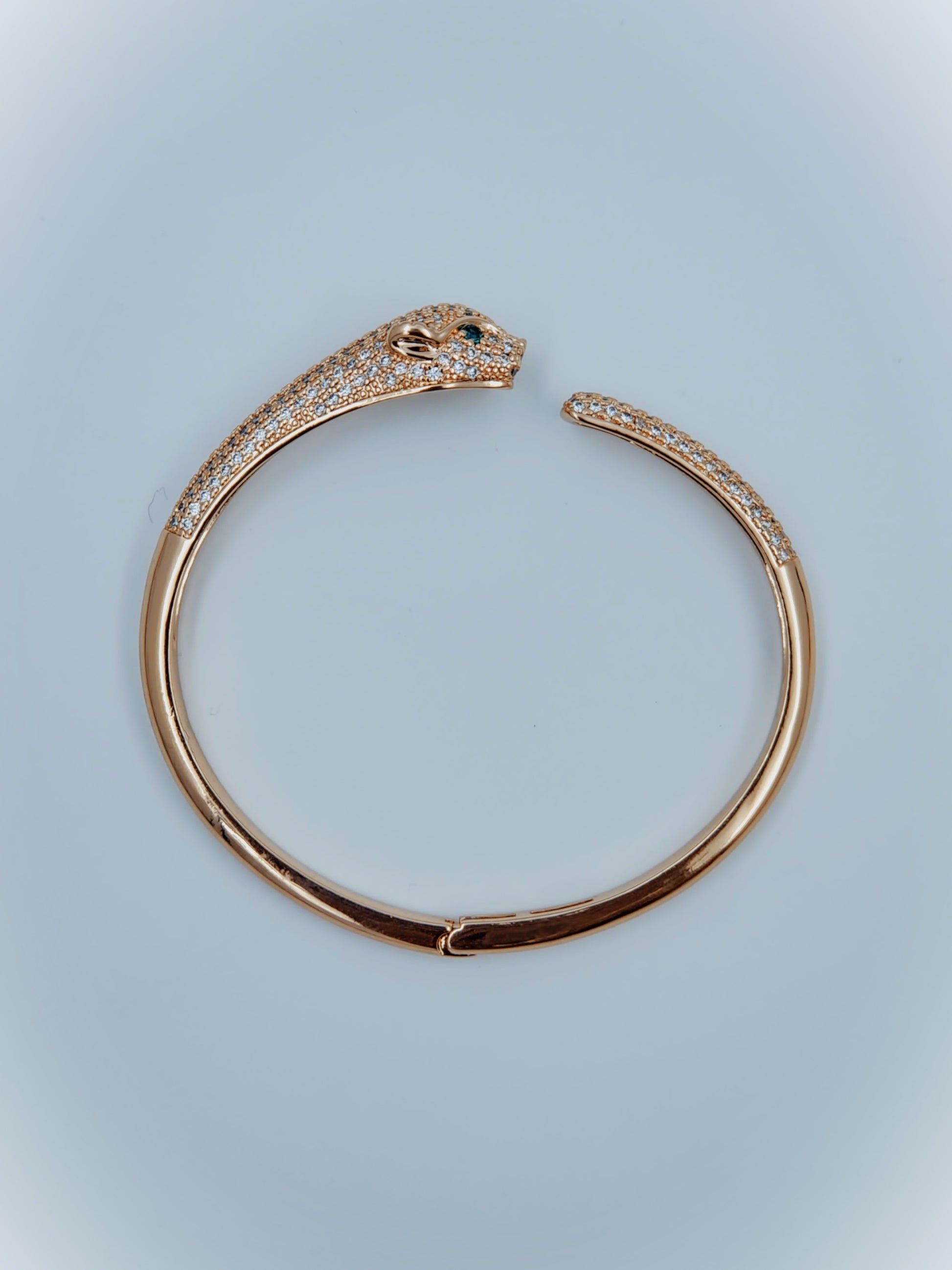 The Emerald-Eyed Pavé CZ Rose Gold Bracelet is crafted with a refined panther-inspired design, featuring a smooth rose-gold finish and precision-set pavé CZ stones for a subtle, premium shine. The centerpiece is enhanced with emerald-toned eyes, adding a distinct and sophisticated character to the piece.