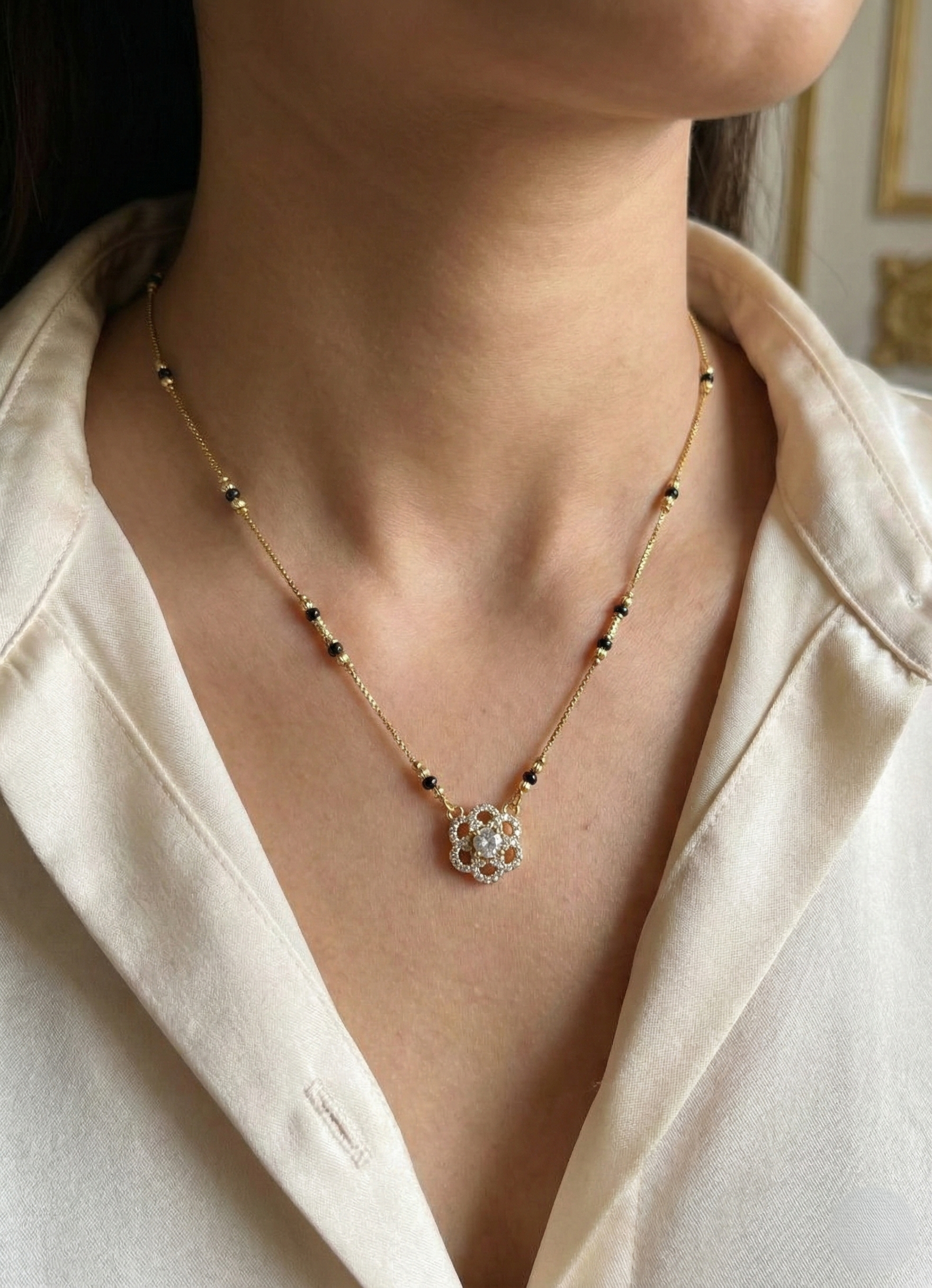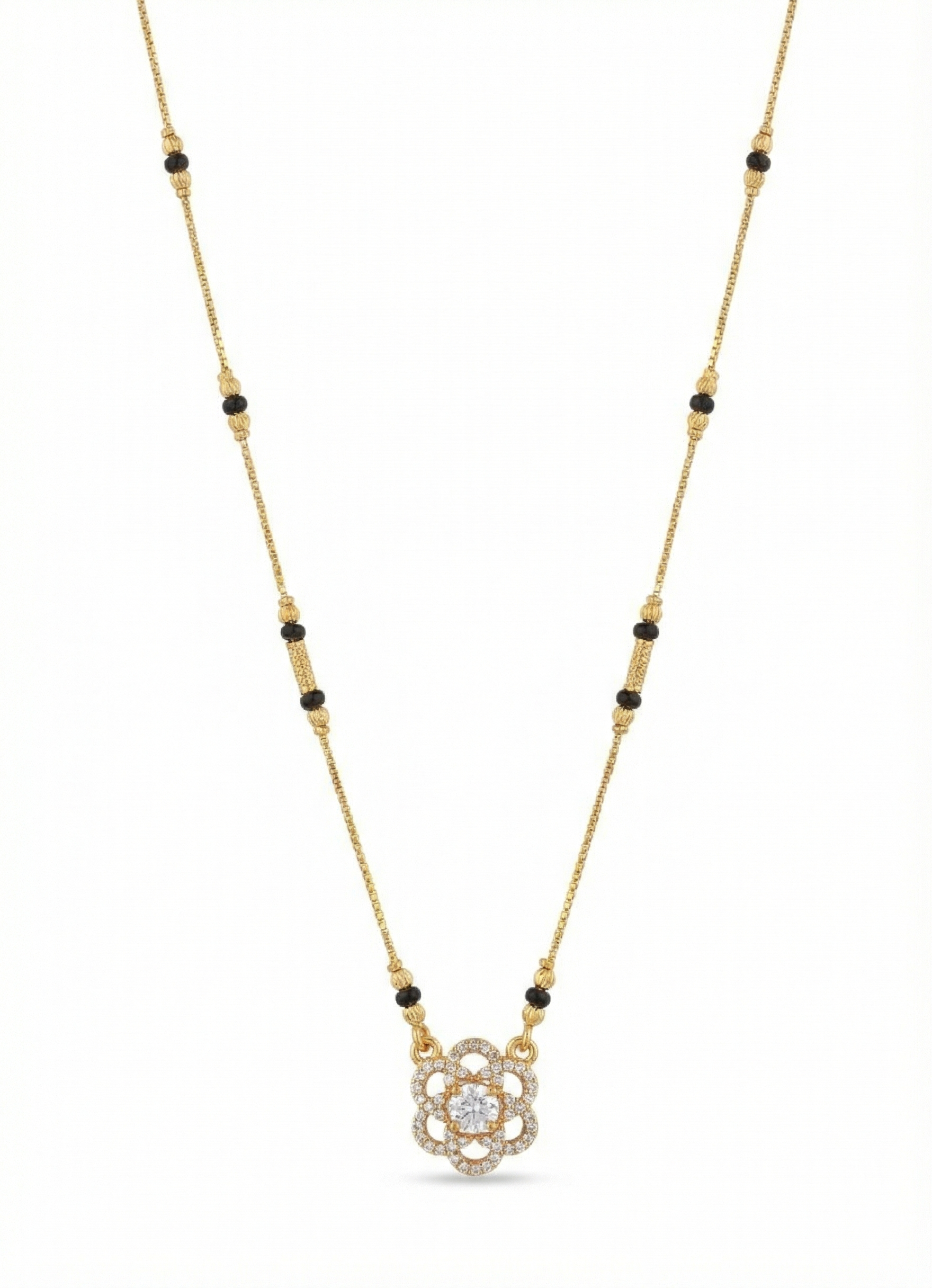 Perfectly balanced and endlessly elegant — this gold mangalsutra features a circular rosette pendant with an intricate open petal framework, each curve delicately lined with sparkling CZ diamonds and anchored by a brilliant round solitaire at its heart. The mandala-like symmetry of the flower gives it a sacred, meditative quality that feels both deeply traditional and wonderfully modern. Paired with an ornate textured gold and black bead chain, this is a mangalsutra that grows more beautiful the longer you look at it — made for the bride who values quiet, enduring elegance.