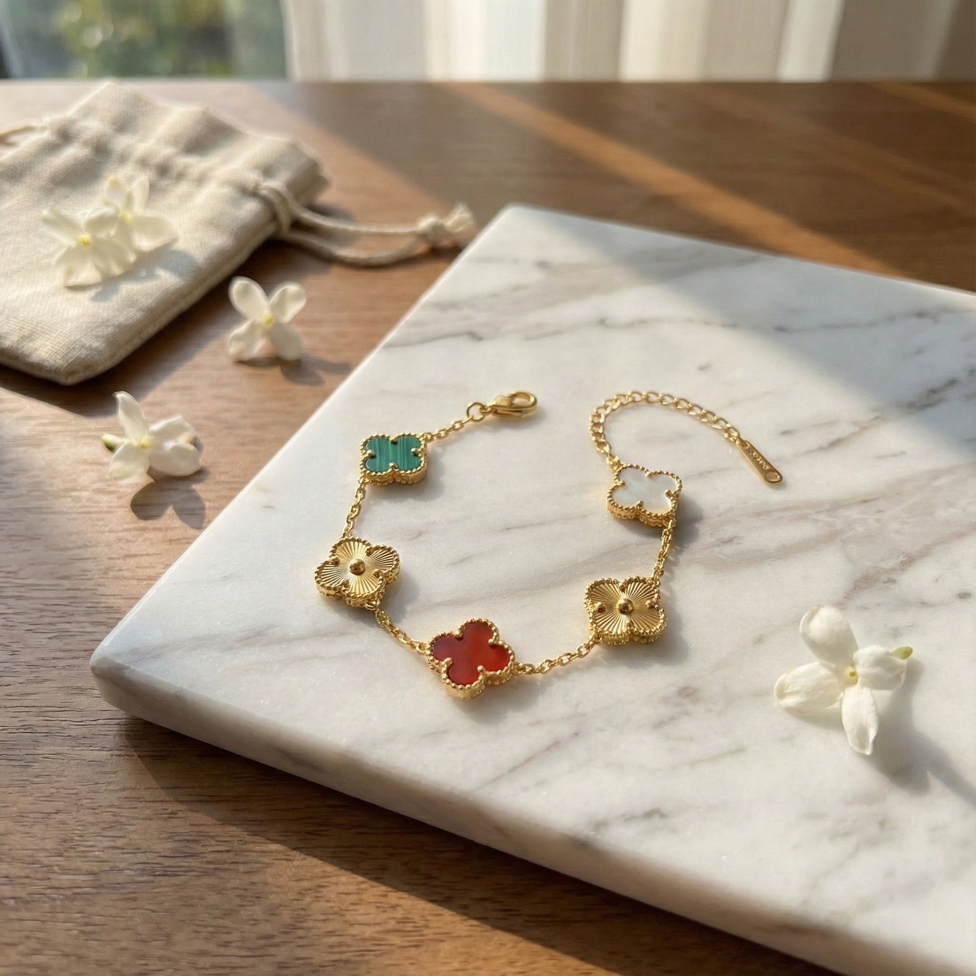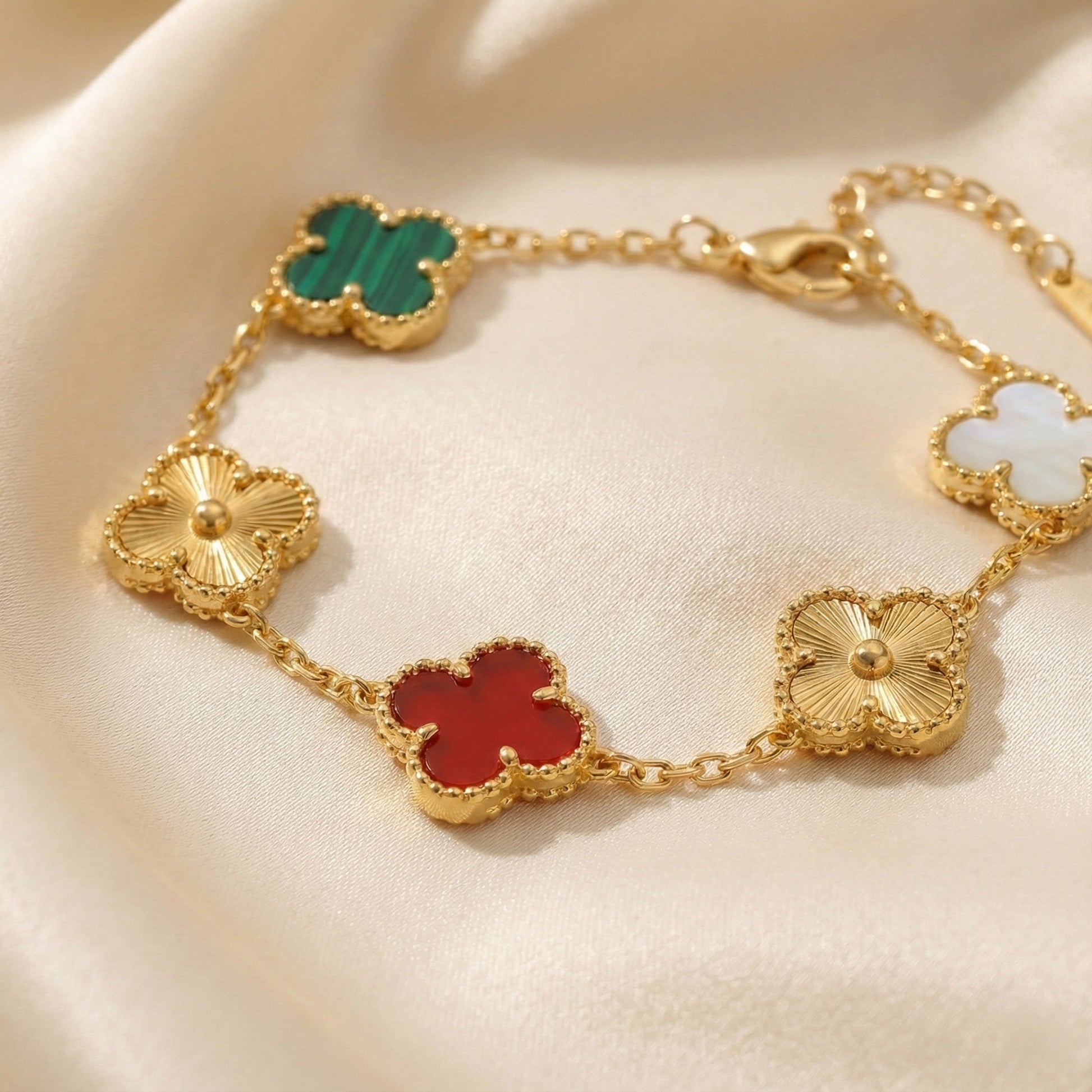Elevate your jewelry collection with this stunning multi color clover bracelet featuring five elegant four-leaf clover motifs in sleek black enamel, beautifully edged with gold plated beaded detailing. This lucky charm bracelet combines timeless design with premium craftsmanship, perfect for women who love minimalist yet sophisticated accessories. The adjustable chain ensures a comfortable fit for all wrist sizes, while the secure lobster clasp provides reliable everyday wear. Ideal for gifting on birthdays, anniversaries, or as a symbol of good luck and prosperity. This versatile fashion bracelet pairs effortlessly with casual, formal, and ethnic outfits, making it a must-have addition to your accessory collection.