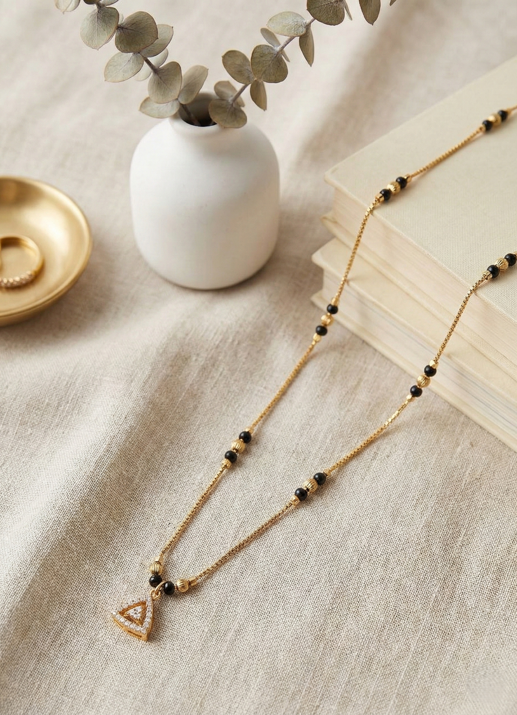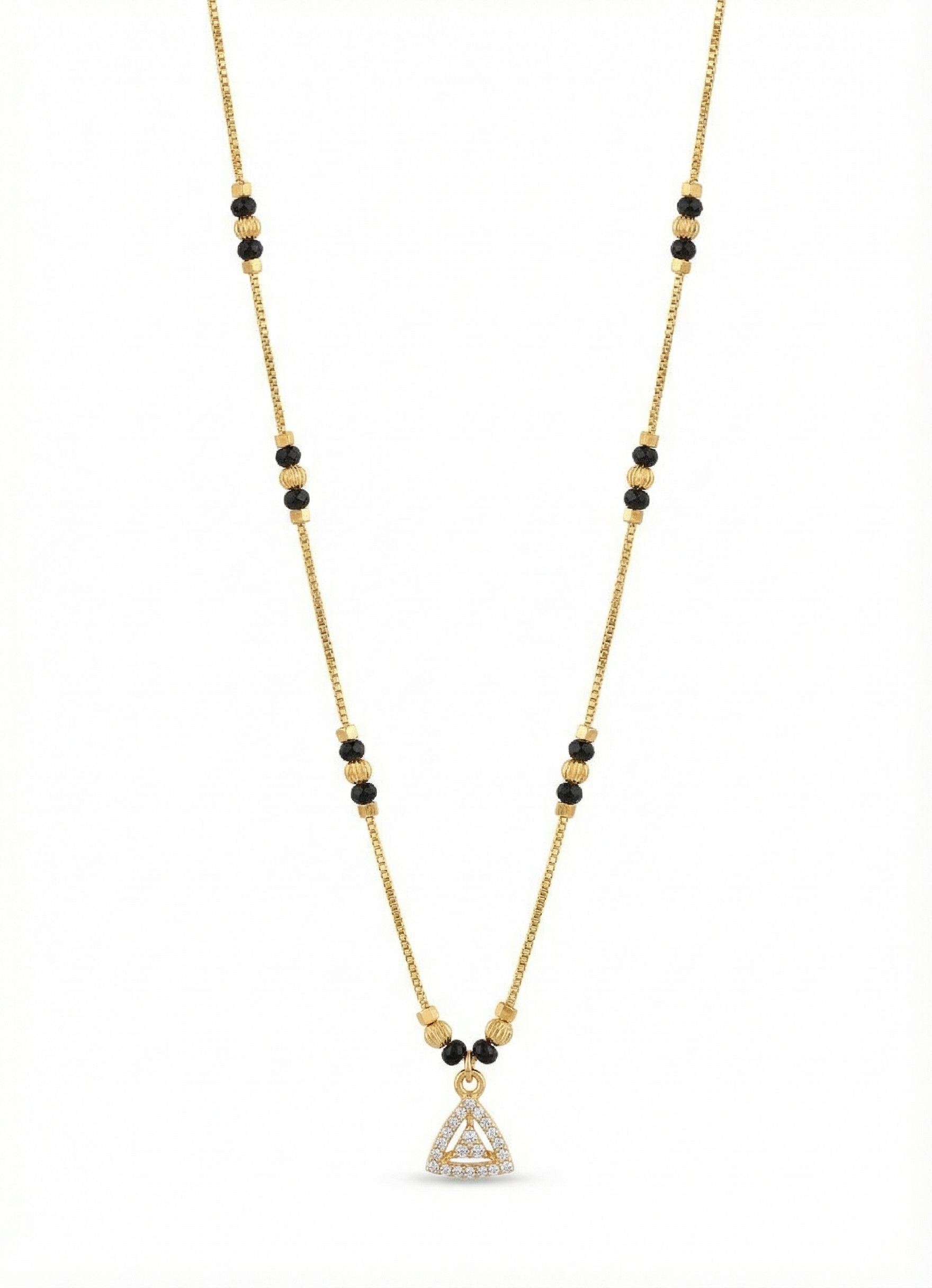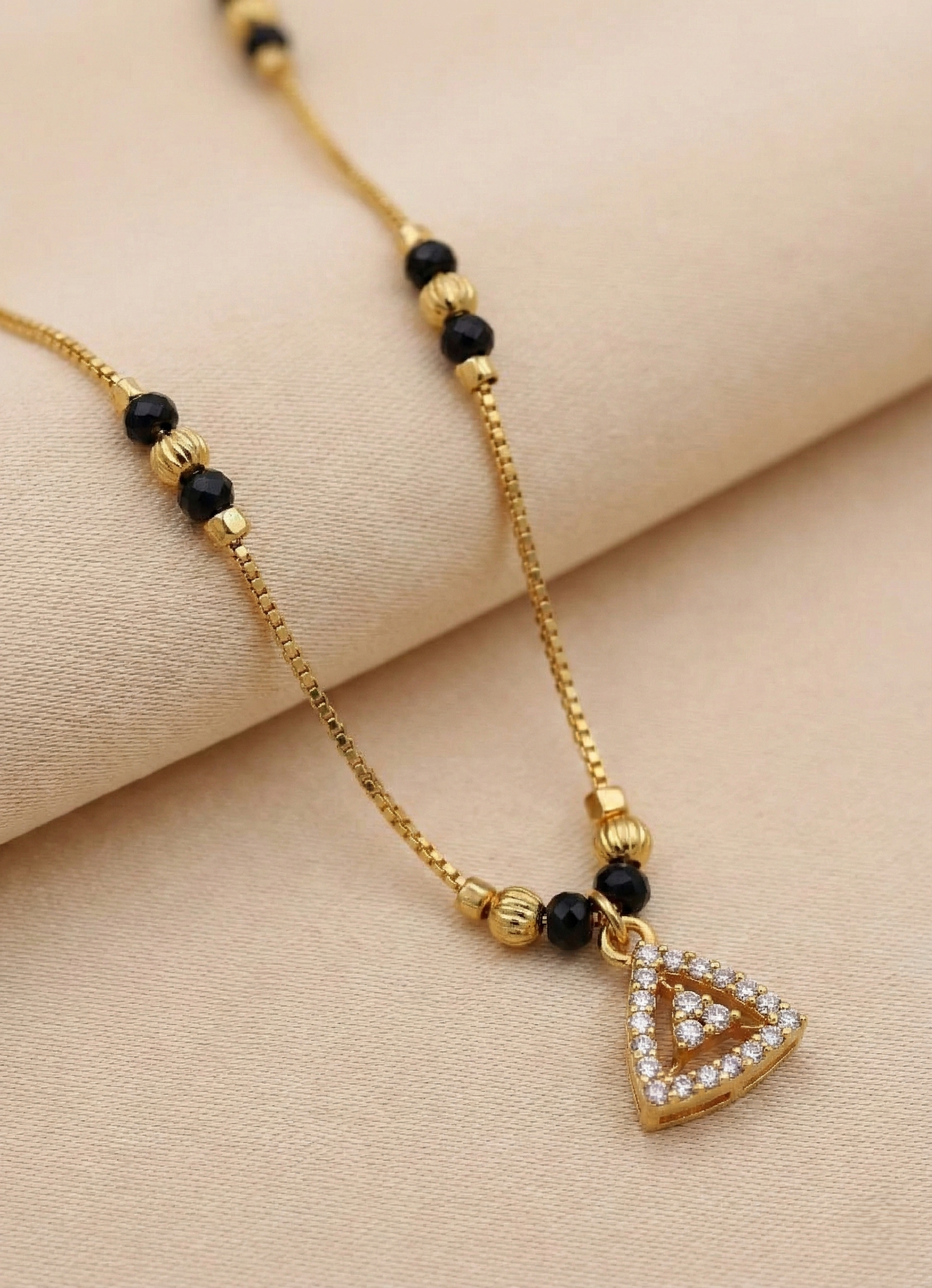 A modern triangular pendant traced with sparkling CZ diamonds β symbolising balance, strength, and the beautiful alignment of your shared journey. Paired with a delicate gold-plated chain and classic black beads, this sharp, minimalist piece is perfect for an elegant daily look.