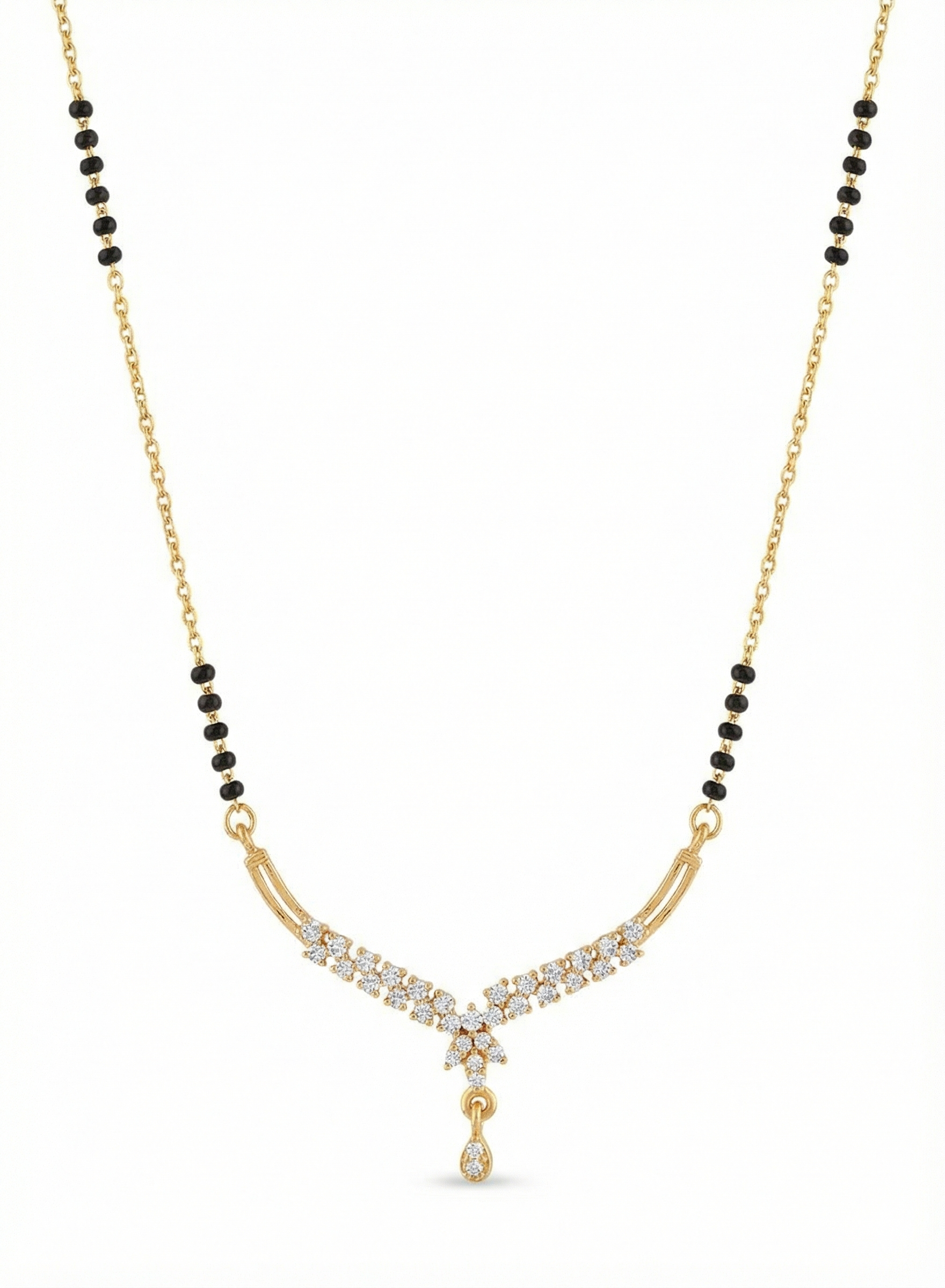 An effortlessly elegant mangalsutra featuring a graceful V-shaped CZ diamond bar pendant that flows seamlessly into a delicate teardrop drop at the center. The continuous sparkle across the V-form creates a neckline-hugging silhouette that feels both classic and contemporary. Paired with a fine black bead and gold chain, this lightweight, radiant piece is perfect for brides who love timeless simplicity with a brilliant touch.