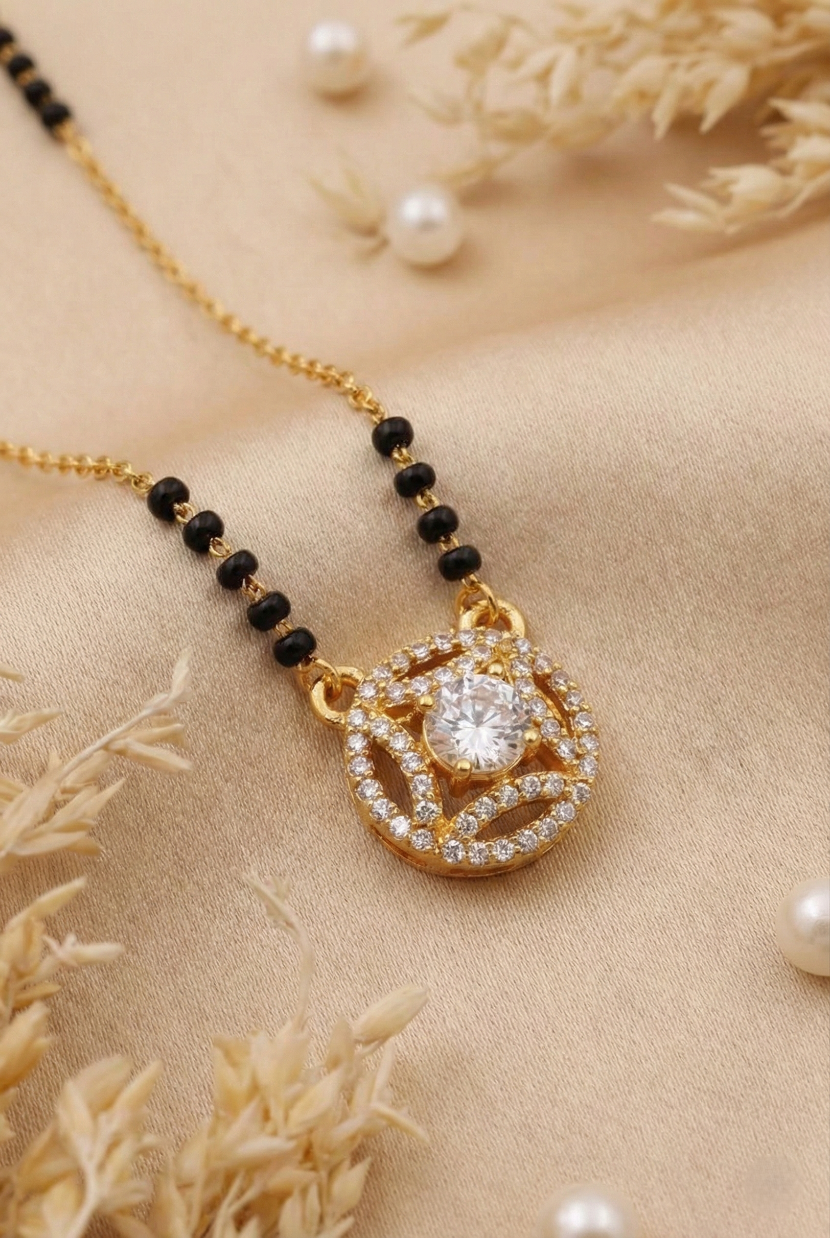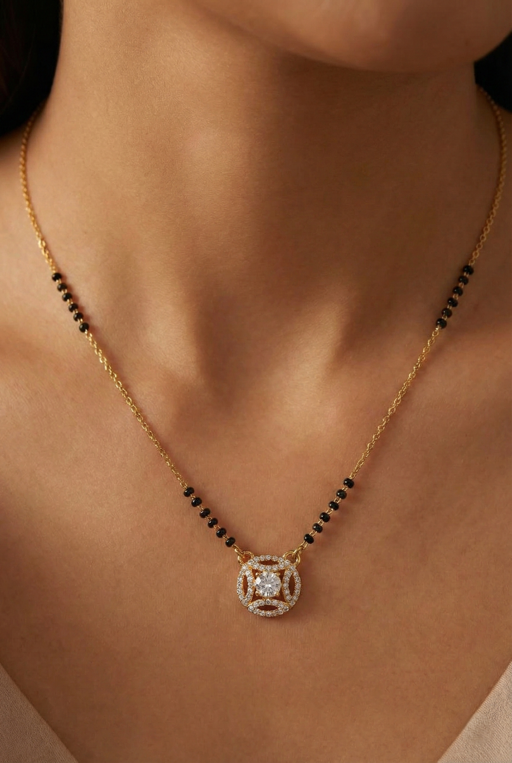 A radiant central solitaire framed by a shimmering star-shaped halo within a circular rim — symbolising the guiding light of a shared journey. Complemented by a delicate gold-plated chain and traditional black beads, this piece offers a brilliant, modern touch for everyday elegance.